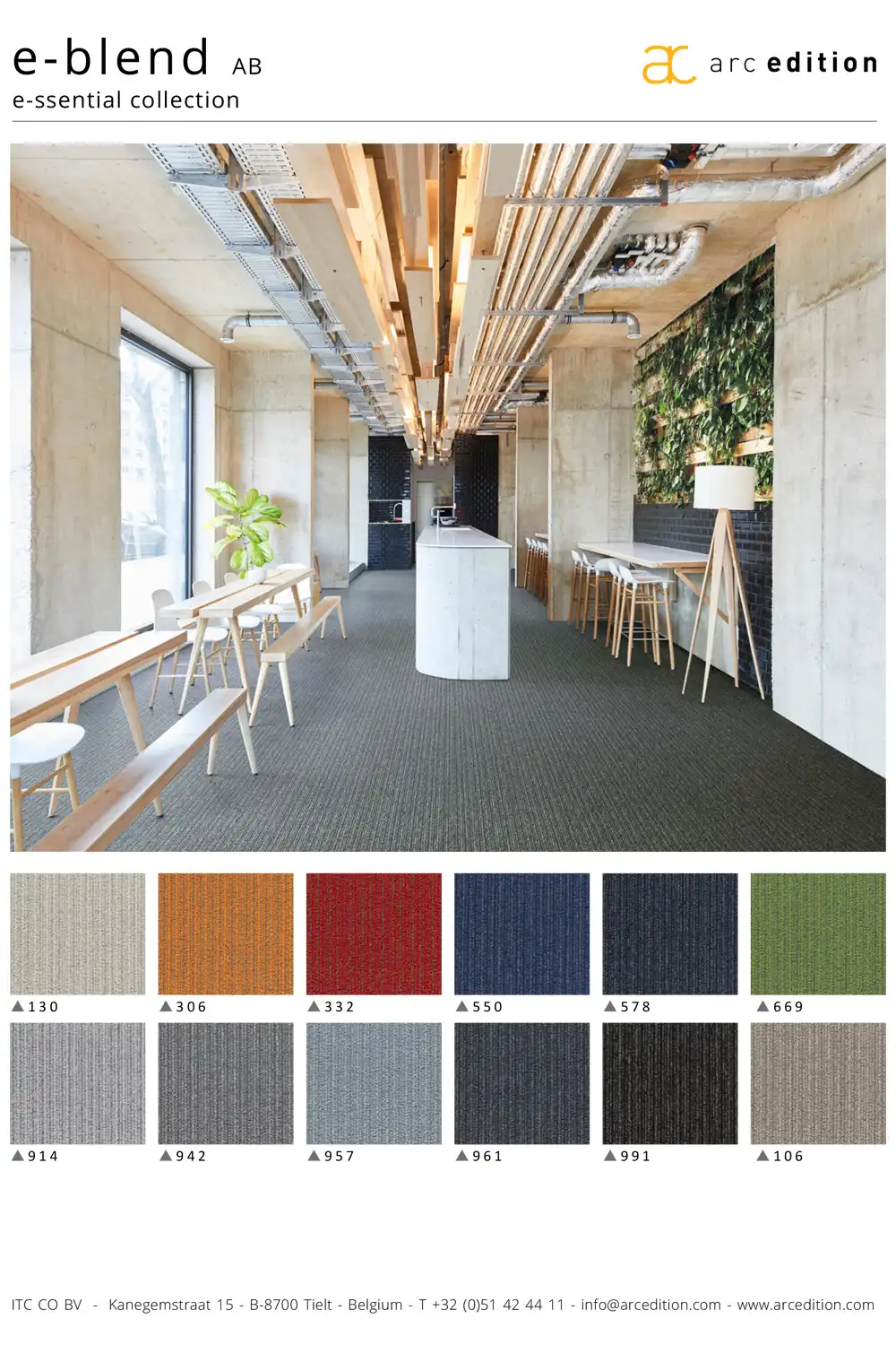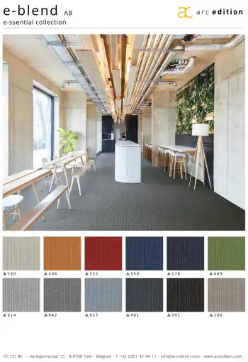 Koberce z kolekce e-blend jsou vyrobeny z polyamidového vlákna s podkladem ActionBack (tkaná syntetická juta), které je pružné a odolné vůči mechanickému poškození. Vlákna jsou ve 2 barvách, které se spojují do nové textury smyčkového vlasu, který má tkaný, lineární aspekt a hustý, odolný povrch. Vysoce funkční koberec nabízí odvážné odstíny i klasické tóny.