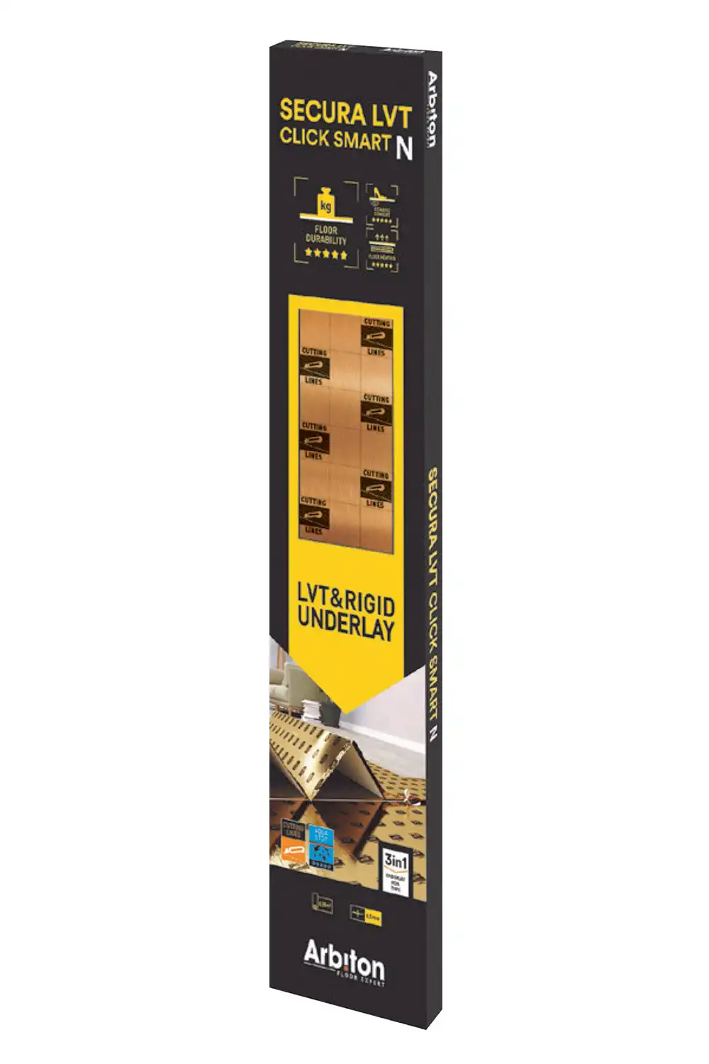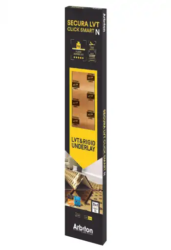 Podložka pod vinylovou podlahu Arbiton Secura LVT Click Smart N je vyrobena z extrudovaného polystyrenu ve tvaru harmoniky s integrovanou parozábranou, spojovací páskou a speciální protiskluzovou vrstvou, která slouží k ochraně zámků podlahy. Díky svému tepelnému odporu dokonale izoluje podlahu před chladem a účinně tlumí zvuky vznikající v místnosti. Je určena do místností s vysokým provozem. Práce s ní je velmi jednoduchá a rychlá vzhledem k jedinečnému systému 3in1.