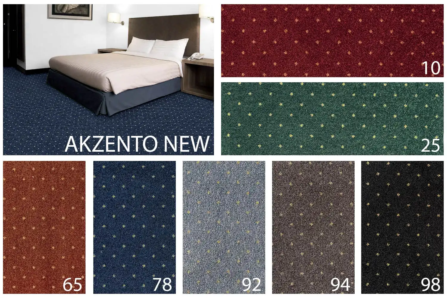 Zátěžový metrážní koberec Akzento New je vyráběn z polyamidových vláken s jemně střiženým povrchem, který svým tradičním tištěným motivem dodává podlaze klasický design a kvalitu. Koberec má podklad ActionBack (tkaná syntetická juta), který je pevný a odolný. Jeho jemný, ale pevný povrch je ideální pro použití v hotelech, pracovnách a jiných reprezentativních místnostech. Je určen do komerčních prostor s běžným namáháním.