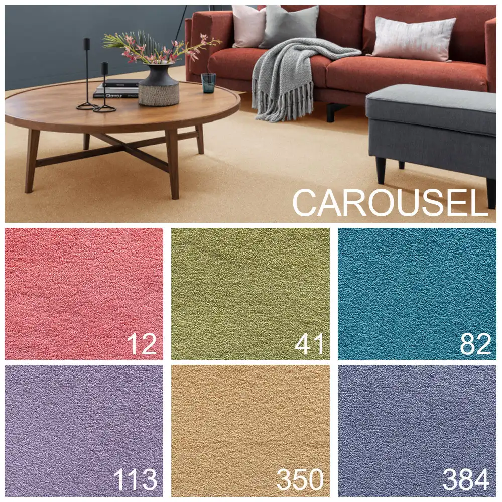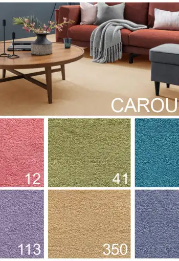 Koberce z kolekce CAROUSEL okamžitě zaujmou svým příjemným vzhledem. Jejich vyšší velurový vlas Vás okouzlí svojí hebkostí a měkkým došlapem. Pokud hledáte kvalitní koberec do obývacího pokoje, ložnice nebo metrážní koberec do pokoje pro hosty, CAROUSEL je ideální volbou. Koberec je vyroben z odolného polypropylenu, který je nenáročný na údržbu a snadno se čistí. Filcový podklad účinně snižuje kročejový hluk a spolu s precizním zpracováním zaručuje vysoký komfort. Tento koberec je vhodný i pro podlahové topení. S koberci CAROUSEL dodáte svému domovu pohodlí a rafinovanou eleganci. Své využití najde i ve školce.
