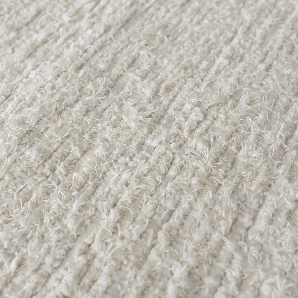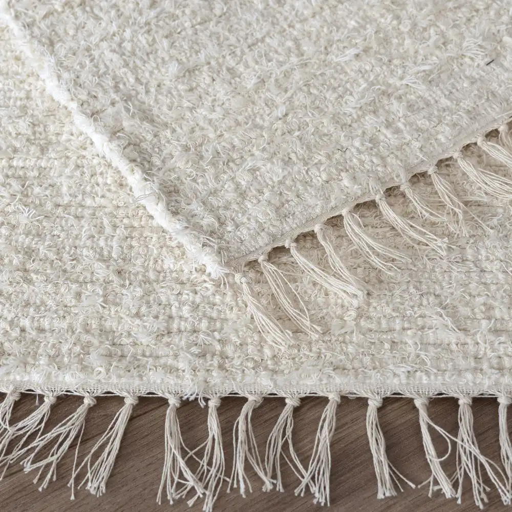 Každý koberec je pečlivě ručně tkaný, což zaručuje jedinečný vzhled a kvalitu. Výroba ze zbytků textilií nejen snižuje ekologickou stopu, ale dává také nový život recyklovaným materiálům. Vzhledem k ruční práci je možné, že se v odstínu koberce objeví jemná barevná odchylka, což jen podtrhuje jeho autentičnost. Tento koberec je jako stvořený do zimních zahrad, venkovských kuchyní nebo interiérů laděných v přírodním stylu. Jeho neutrální béžová barva se snadno kombinuje se dřevem, ratanem nebo lněným textilem, čímž vytváří harmonické a teplé prostředí.