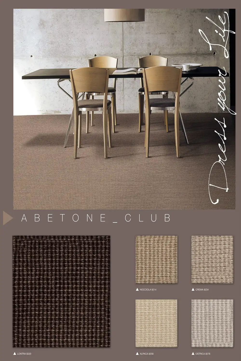 Reprezentatívny koberec ABETONE CLUB je vyrobený zo 100% vlny, vďaka čomu je trvácny a príjemný na dotyk. Tento elegantný koberec je k dispozícii v širokej škále klasických a moderných odtieňov. Koberec má vďaka použitiu priadze vlny antistatické, zvukové a tepelnoizolačné vlastnosti. Vyznačuje sa tiež veľmi vysokou hustotou vlákna, ktorú môžete nájsť iba u najlepších vlnených kobercov. Zaujme nielen svojím jednoduchým ale zároveň aj luxusným designom.