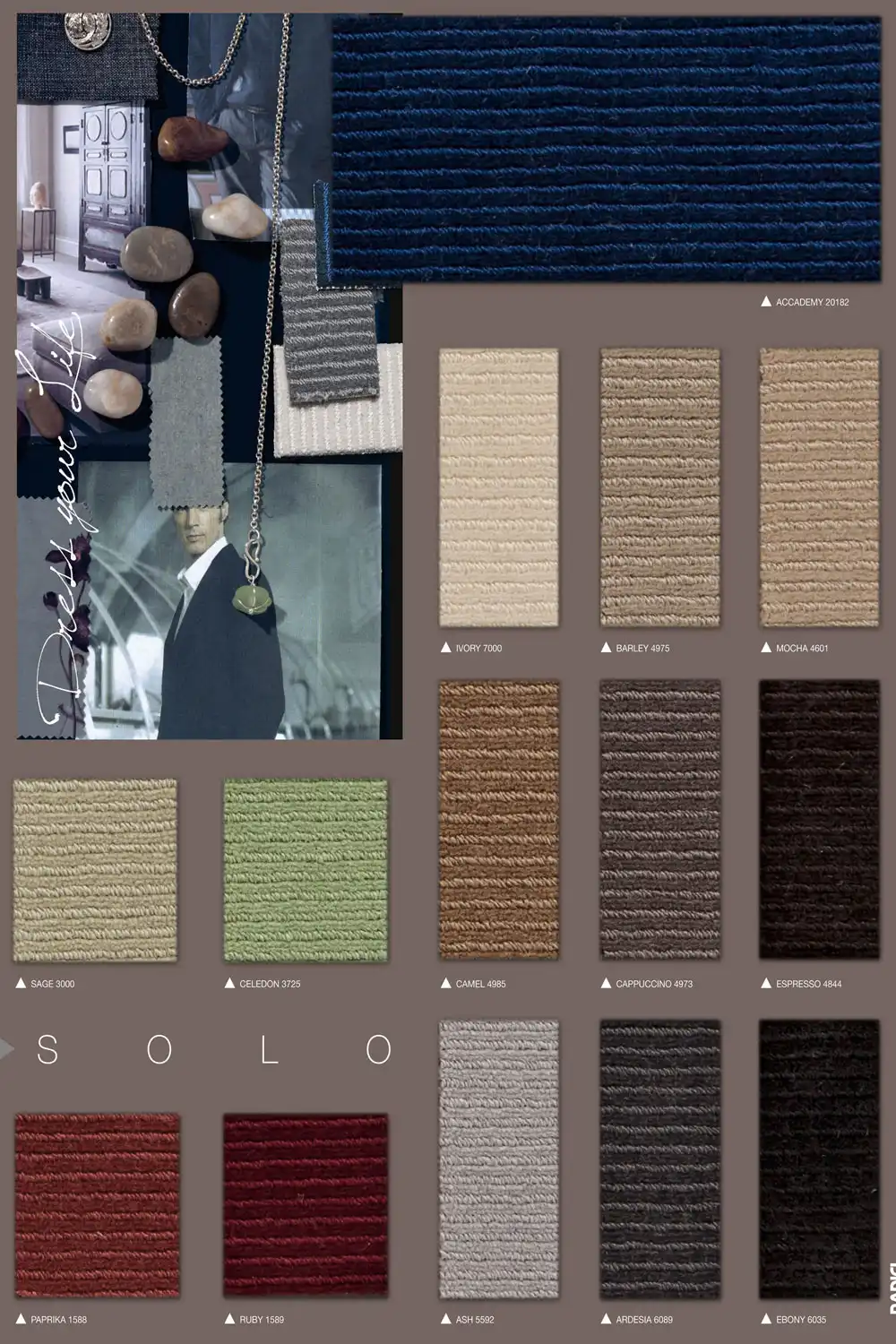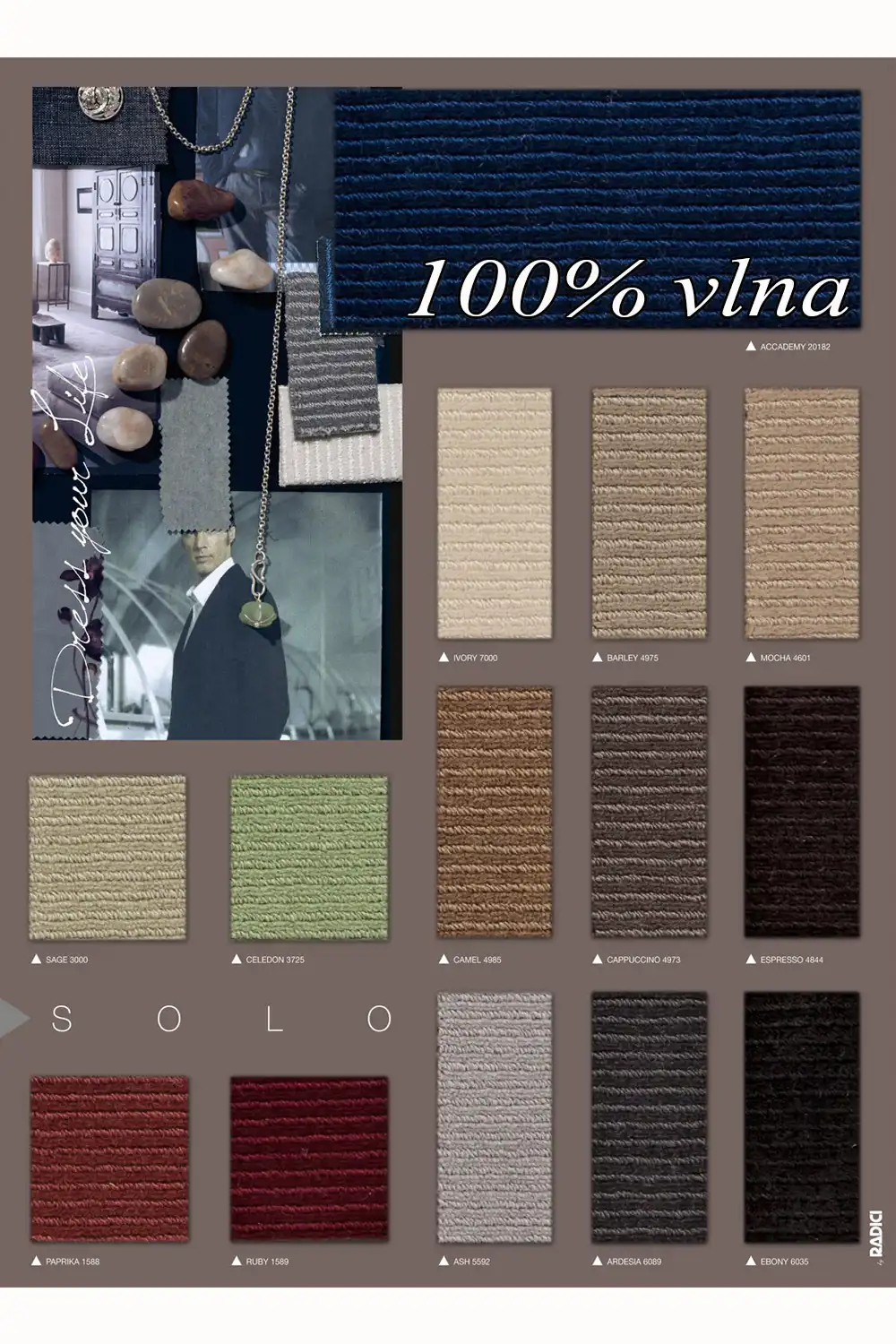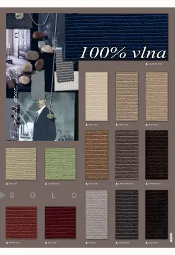 Reprezentativní koberec SOLO je vyroben ze 100% vlny, díky čemuž je trvanlivý a příjemný na dotek. Tento elegantní koberec je k dispozici v široké škále klasických a moderních odstínů. Koberec má díky použití příze vlny antistatické, zvukové a tepelně izolační vlastnosti. Vyznačuje se také velmi vysokou hustotou vlákna, kterou můžete nalézt pouze u nejlepších vlněných koberců. Zaujme nejen svým jednoduchým, ale zároveň i luxusním designem.